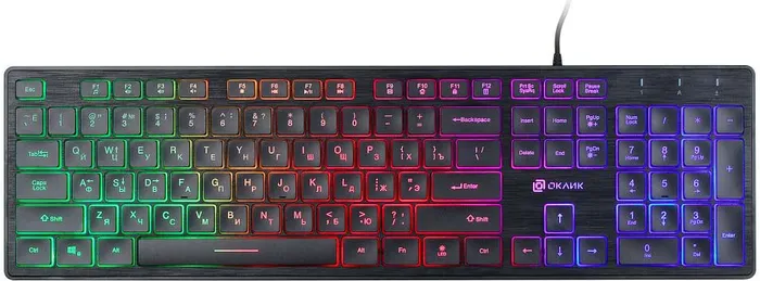 Проводная клавиатура Oklick 550ML выполнена в элегантном Slim-дизайне и оснащена яркой многоцветной LED-подсветкой. Модель имеет полноразмерный формат. Она оборудована 104 клавишами с большим ресурсом нажатий – до 10 млн. Мультимедийные клавиши Fn + F1-F12 позволят комфортно и быстро управлять различными функциями. Например, можно мгновенно открывать электронную почту, запускать калькулятор или регулировать громкость. Комбинации Fn +PgUp-PgDn помогут менять яркость подсветки. Отдельная клавиша LED предназначена для включения и отключения подсветки.