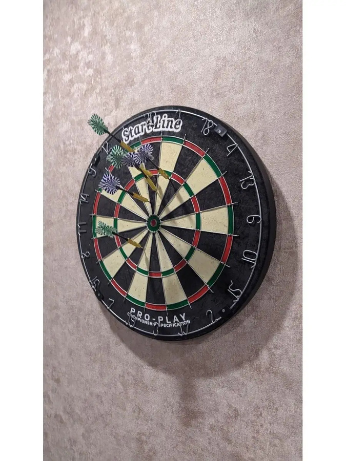 Комплект включает собранные дротики с латунным покрытием высокого качества 6 шт x 18 гр (3 дротика с синим хвостовым оперением и 3 с зеленым хвостовым оперением), а также крепление для подвешивания к стене.