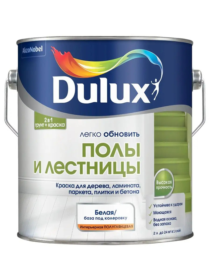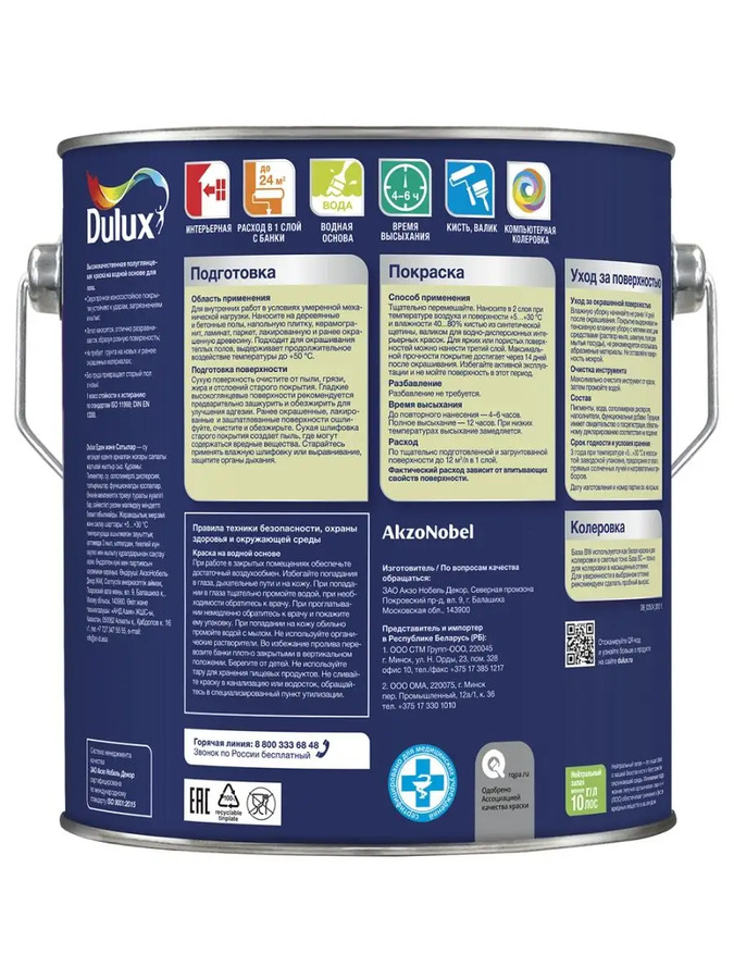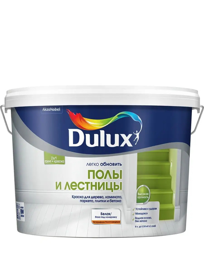 Высококачественная полуглянцевая краска на водной основе для пола. Сверхпрочное износостойкое покрытие устойчиво к ударам, загрязнениям и мытью. Без труда превращает старый пол в новый. Не требует грунта на новых и ранее окрашенных материалах. Краска легко наносится, отлично разравнивается, образуя ровную поверхность. Как наносить? Перед применением тщательно перемешайте. Наносите в 2 слоя при температуре воздуха и поверхности +5…+30 °С и относительной влажности воздуха от 40 до 80%. Используйте кисть из синтетической щетины, валик для водно-дисперсионных интерьерных красок. Для ярких или пористых поверхностей можно нанести третий слой.