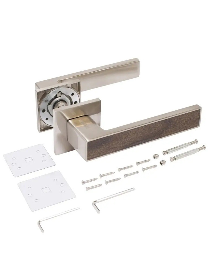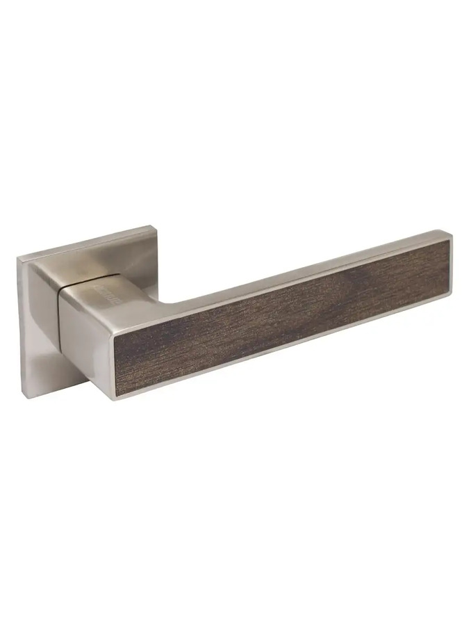 Ручка дверная межкомнатная (матовый никель, коричневое дерево) с защитной пленкой АЛЛЮР АРТ "ЛАНА" SN (868KOD). Ручка дверная межкомнатная на квадратной накладке. Материал ручек — алюминиевый сплав, накладки — цинковый сплав. Многослойное гальваническое покрытие. Комплектуются винтовыми стяжками и шурупами. Длина разрезного квадрата - 105мм.Для дверей, толщиной 35-45 мм.